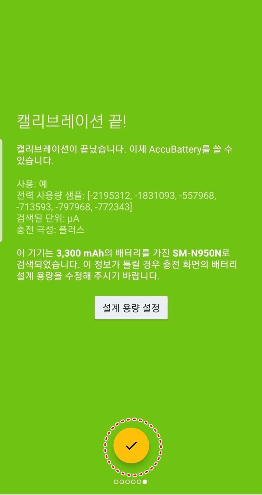차근차근 옆으로 넘기면서 accubattery 앱의 소개 및 내용을 읽어보시면 되고, 마지막 화면에 나타난 체크를 선택하면 배터리 수명 테스트를 할 수 있는 메인 화면이 나타납니다.