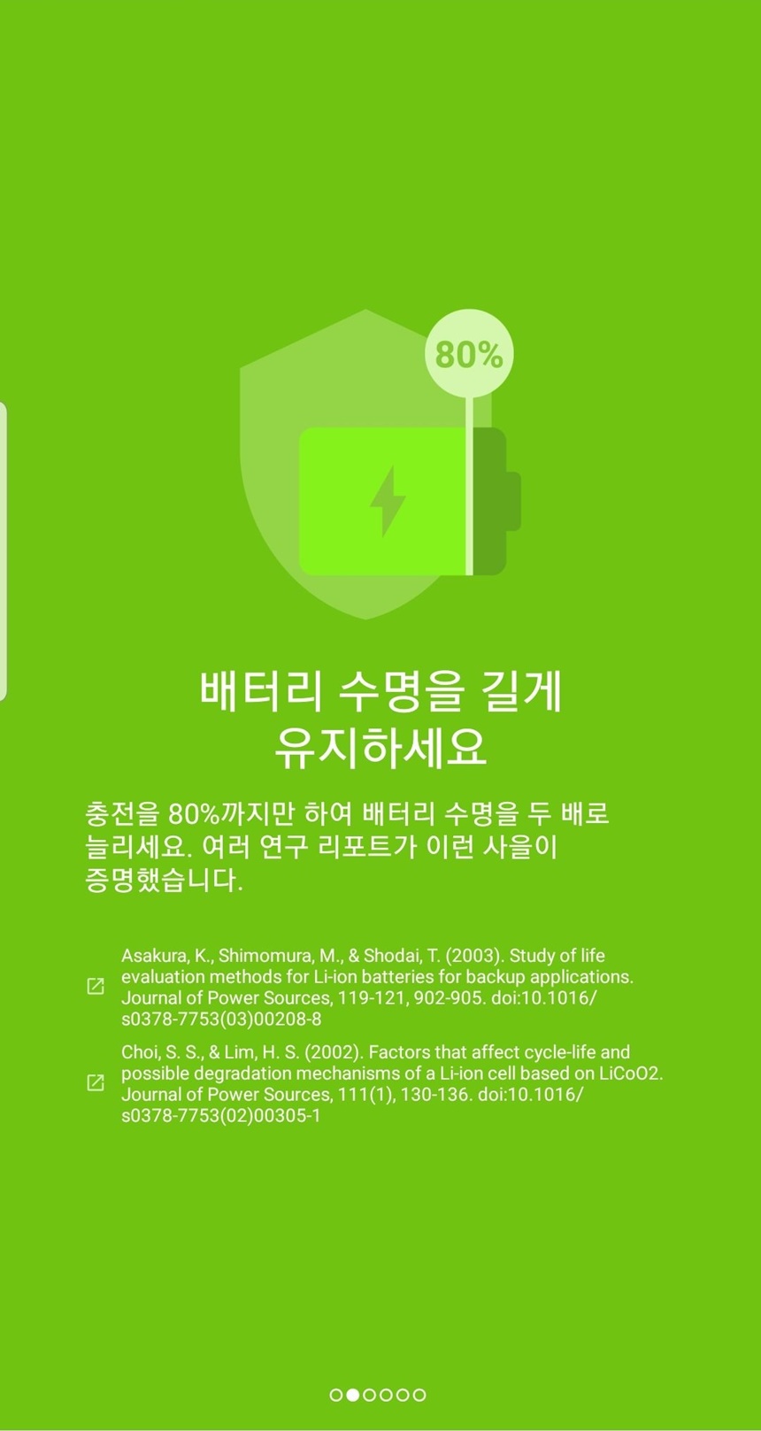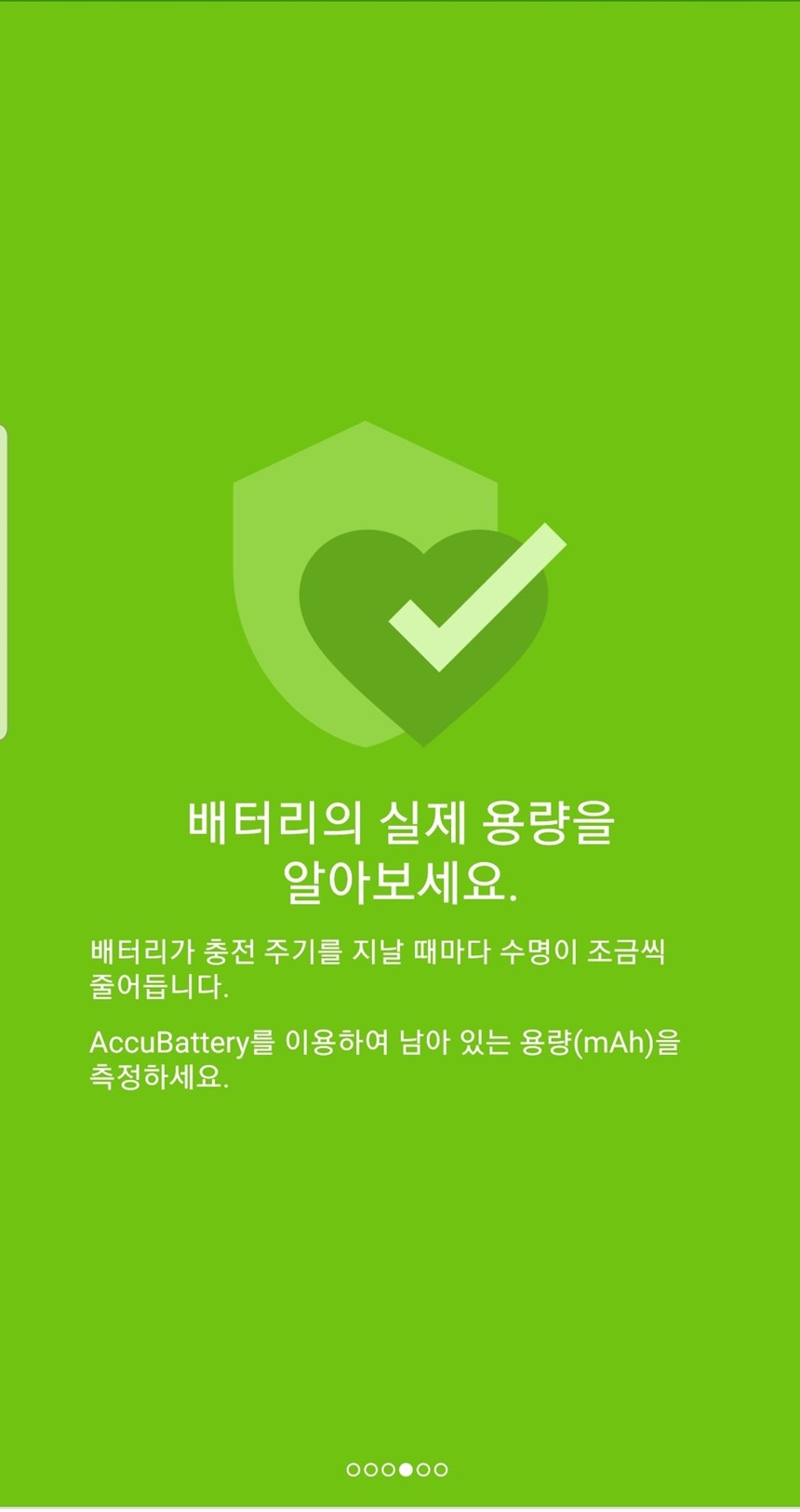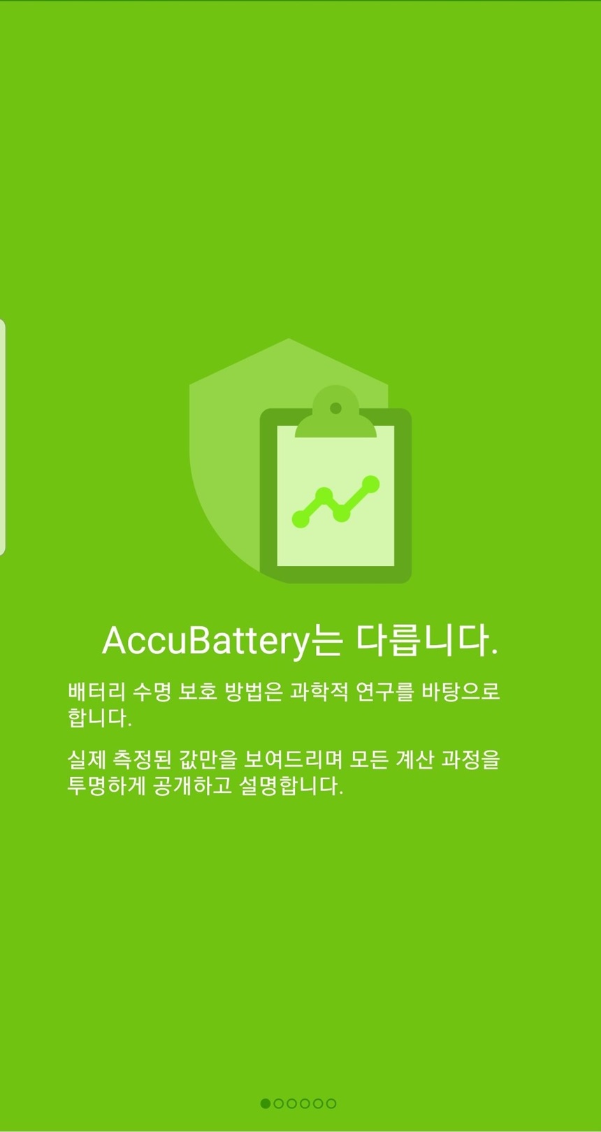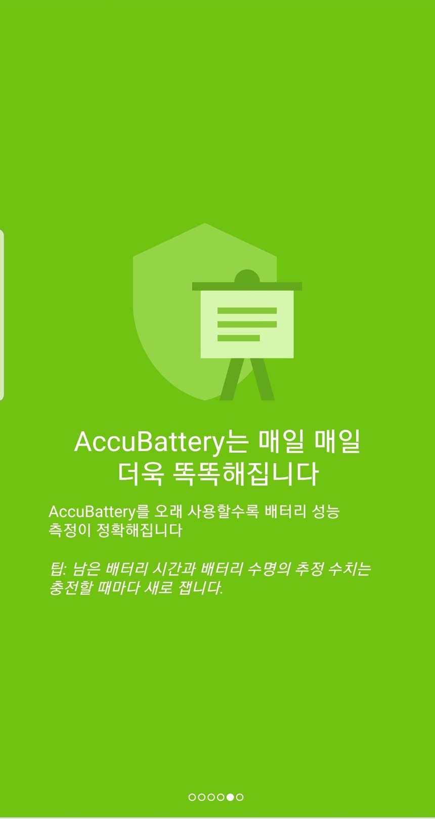 앱을 설치하면 안내 화면이 나오는데 accubattery 앱에 대한 설명과 배터리 수명을 길게 유지하는 방법 등 간략한 앱 소개를 만날 수 있습니다.
